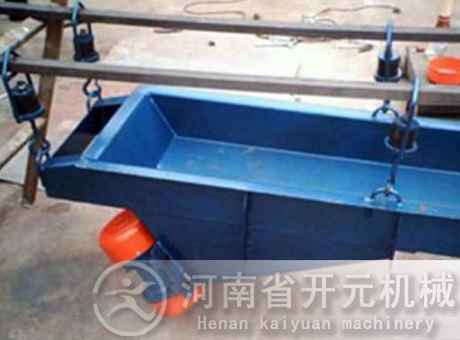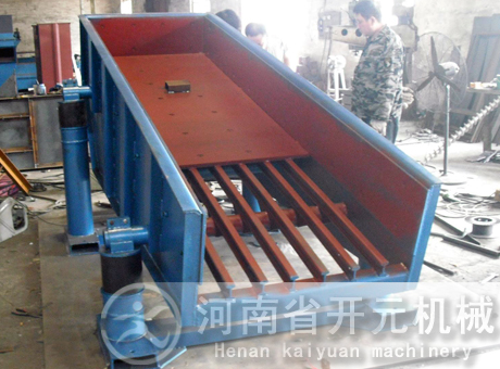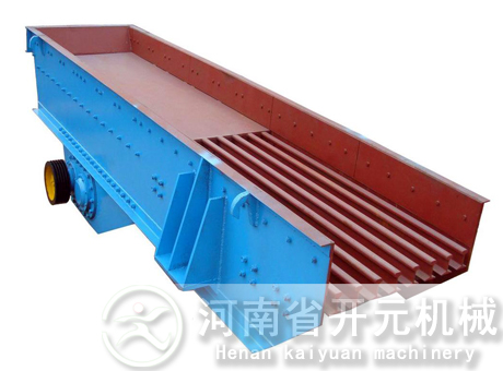 槽式給料機(jī)又稱往復(fù)式或擺動(dòng)式給料機(jī),它是貯礦槽排料應(yīng)用較早的一種給料設(shè)備。型式較多,其結(jié)構(gòu)的共同點(diǎn)是均裝有可控制料層高度的調(diào)節(jié)閘板;在輸料槽下部為一前后移動(dòng)的給料板。其不同點(diǎn)是給料板角度不一樣,一般為沿卸料方向向下傾斜5度以及更大的傾角(小于物料的靜堆積角)和角度為零的水平型等。給料板的動(dòng)作有前后往復(fù)移動(dòng)式,抖動(dòng)式以及擺動(dòng)式等。傳動(dòng)機(jī)構(gòu)均為曲柄回轉(zhuǎn)式。