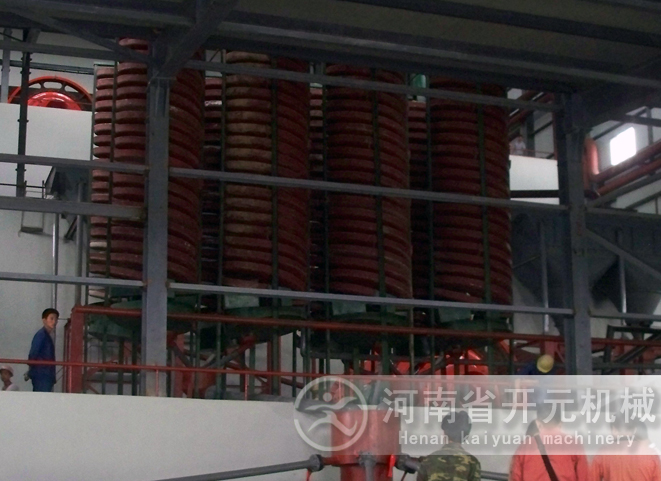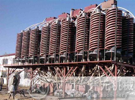 將螺旋溜槽通過螺旋支架立起,校準垂直線,用鐵架固定在合適的位置,由砂泵將礦砂送到螺旋上頂兩個進料口處,加入補充水,調節(jié)礦槳濃度,礦槳自然從高往下旋流,在旋轉的斜面流速中產生一種慣性的離心力,以礦砂的比重、粒度、形狀上的差異,通過旋流的重力和離心力的作用,將礦與砂分開,精礦流入精礦斗用管道接出,尾砂流進尾砂斗用管道接到砂池,再用砂泵排走,完成了選礦的全過程
